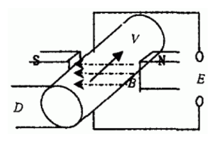 根據(jù)法拉第電磁感應(yīng)的定律,就是導(dǎo)電液體在磁場中切割磁力線運(yùn)動時(shí),導(dǎo)體中產(chǎn)生的感應(yīng)電勢(見圖1),其感應(yīng)電勢的大小和磁感應(yīng)強(qiáng)度、流體做切割磁力線強(qiáng)度等一系列因素成正比。